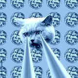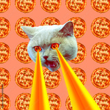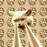 Pizza addict Cat with lasers from eyes. Animal fun collage art
