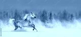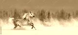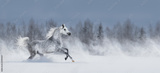Grey arabian horse galloping across snowy field.
