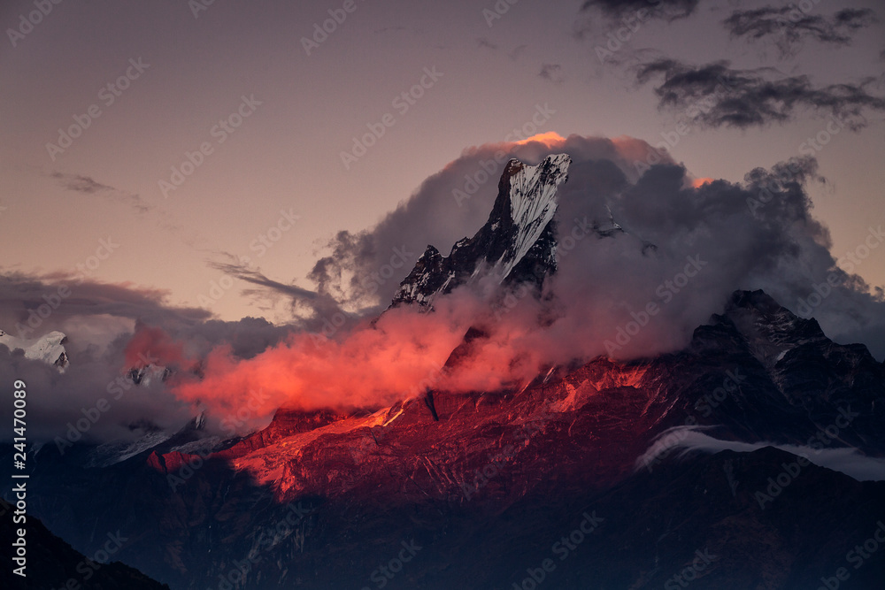 Landscape with Machapuchare-Fishtail peak view from Tadapani during trekking in Himalaya Mountains, Nepal