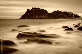 Beautiful landscape view with water in motion and mountain in background. Lofoten, Norway