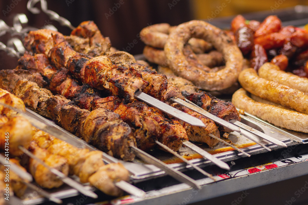 Barbecue skewers with juicy meat and sausage on tray. Food
