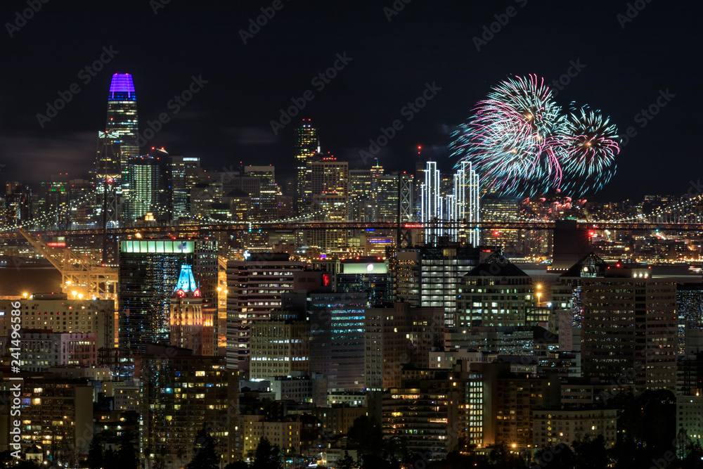 Oakland and San Francisco Downtowns with New Year's Eve 2019 Fireworks. Oakland Hills, Alameda County, California, USA.