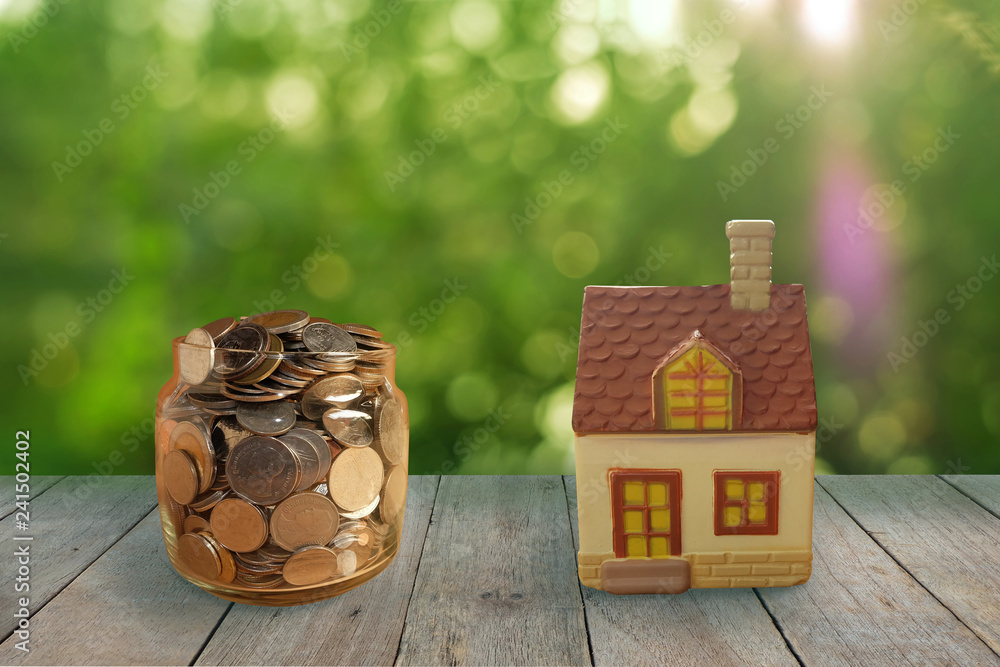 Saving money for home on Wooden floor with blurred green bokeh background.