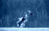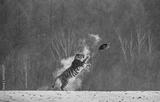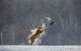 Siberian tiger in a jump catches its prey. Very dynamic shot. China. Harbin. Mudanjiang province. Hengdaohezi park. Siberian Tiger Park. Winter. Hard frost. (Panthera tgris altaica)