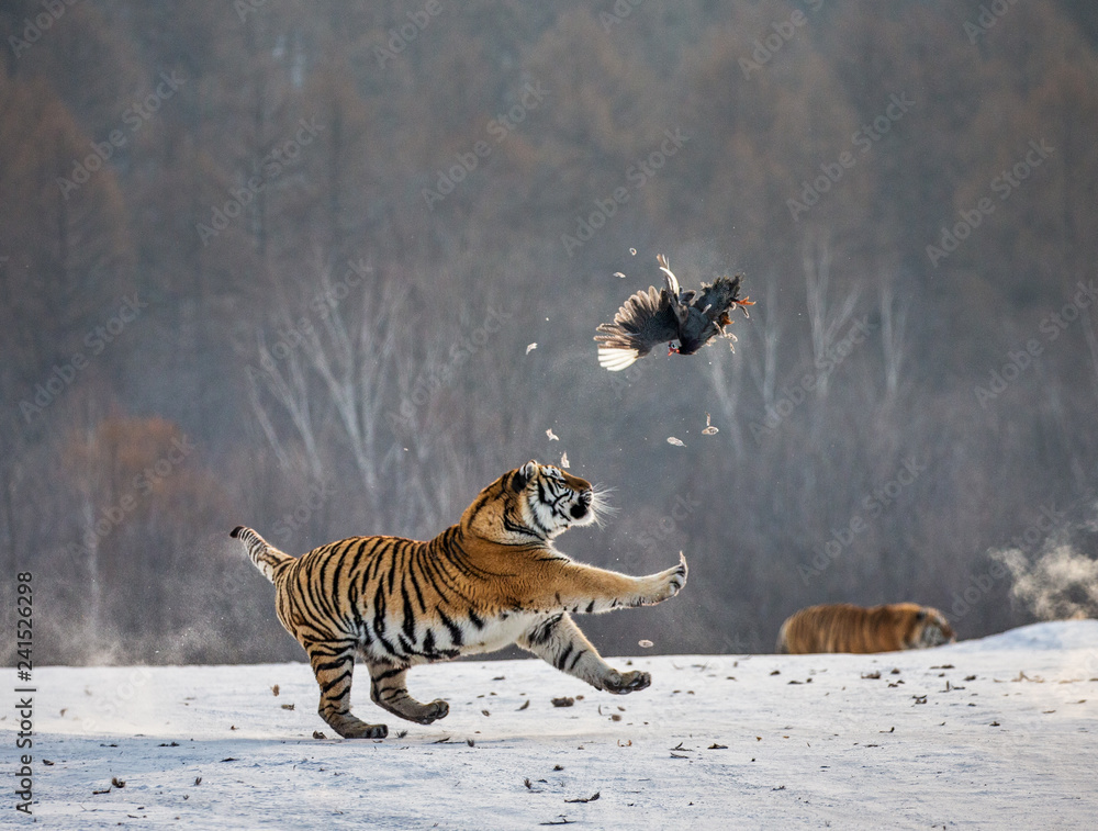Siberian tiger in a jump catches its prey. Very dynamic shot. China. Harbin. Mudanjiang province. Hengdaohezi park. Siberian Tiger Park. Winter. Hard frost. (Panthera tgris altaica)