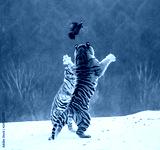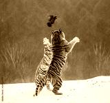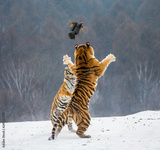 Siberian tiger in a jump catches its prey. Very dynamic shot. China. Harbin. Mudanjiang province. Hengdaohezi park. Siberian Tiger Park. Winter. Hard frost. (Panthera tgris altaica)