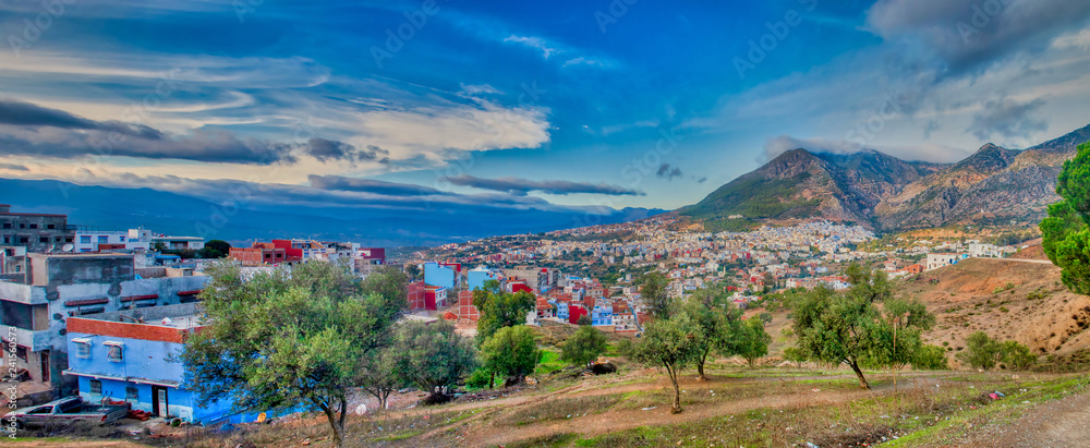 Panoramic view of the village of Chefchaouen, or Chaouen, a picturesque village in the Tangier-Tetouan region, visited by tourists from all over the world, located in northern Morocco