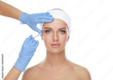 Doctor injecting in a beautiful face of a young woman. Plastic surgery concept.