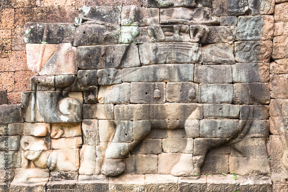 Ancient ruins and bas relief in Siem Reap Park, Cambodia