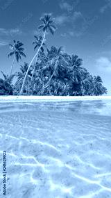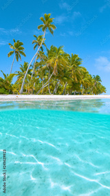 HALF UNDERWATER: Crystal clear water splashes over lens filming exotic island.