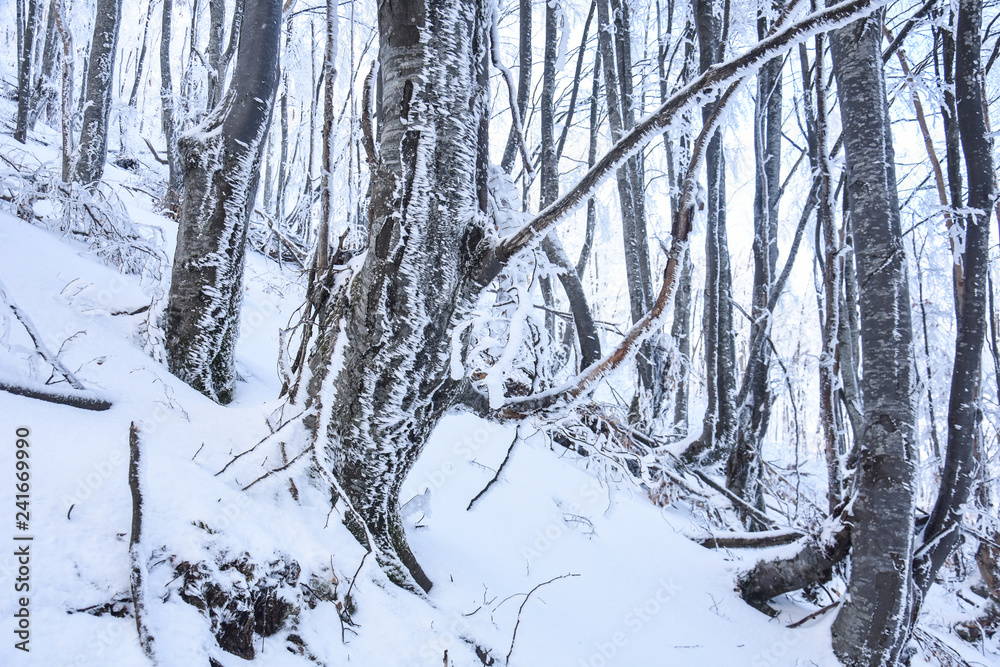 Winter Forest Landscape. Snow on trees in mountain forest. Concept of winter and snow
