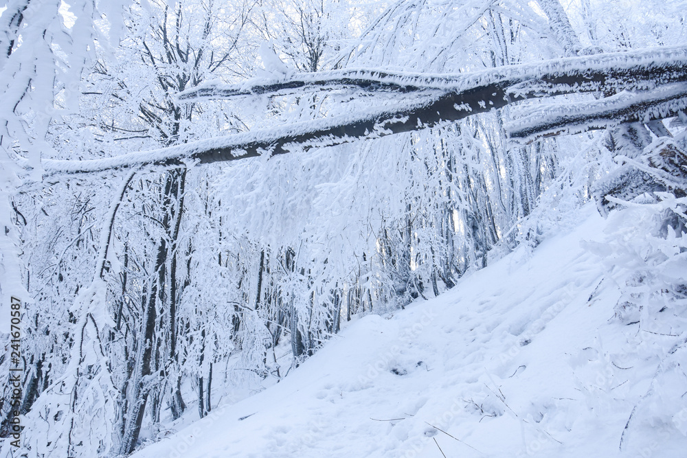 Winter Forest Landscape. Snow on trees in mountain forest. Concept of winter and snow