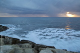 Seascape with rocky shore, waves, heavy swirling clouds in sky and sun rays between horizon and sky, golden light on water