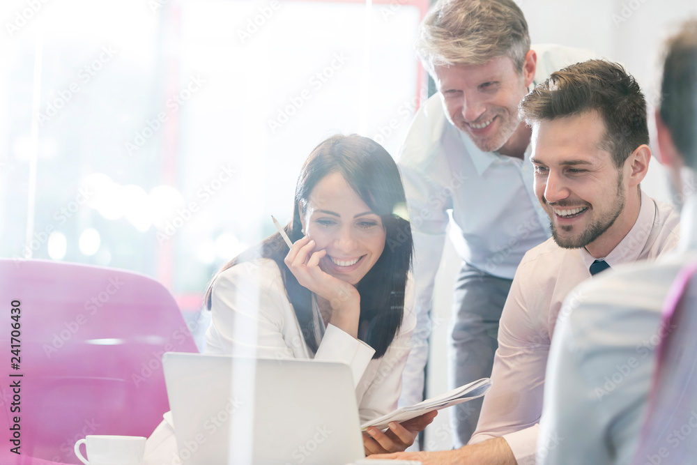 Smiling business people working on laptop at boardroom in office