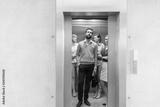 Confident business people standing in elevator at office
