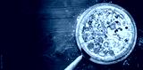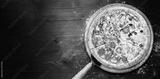 classic Italian pizza on a wooden tray, served in a small authentic Italian restaurant