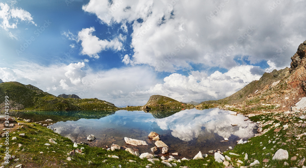 Panoramic photos spring valley Caucasus mountains Arkhyz, Russia. Fabulous sunrise and sunset in the mountains of Sofia lakes, amazing nature, spring in the mountains. Travelling and Hiking