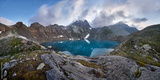 Panoramic photos spring valley Caucasus mountains Arkhyz, Russia. Fabulous sunrise and sunset in the mountains of Sofia lakes, amazing nature, spring in the mountains. Travelling and Hiking
