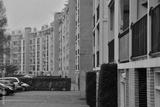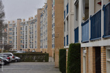 Zakręcony budynek i samochody na parkingu.