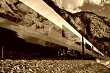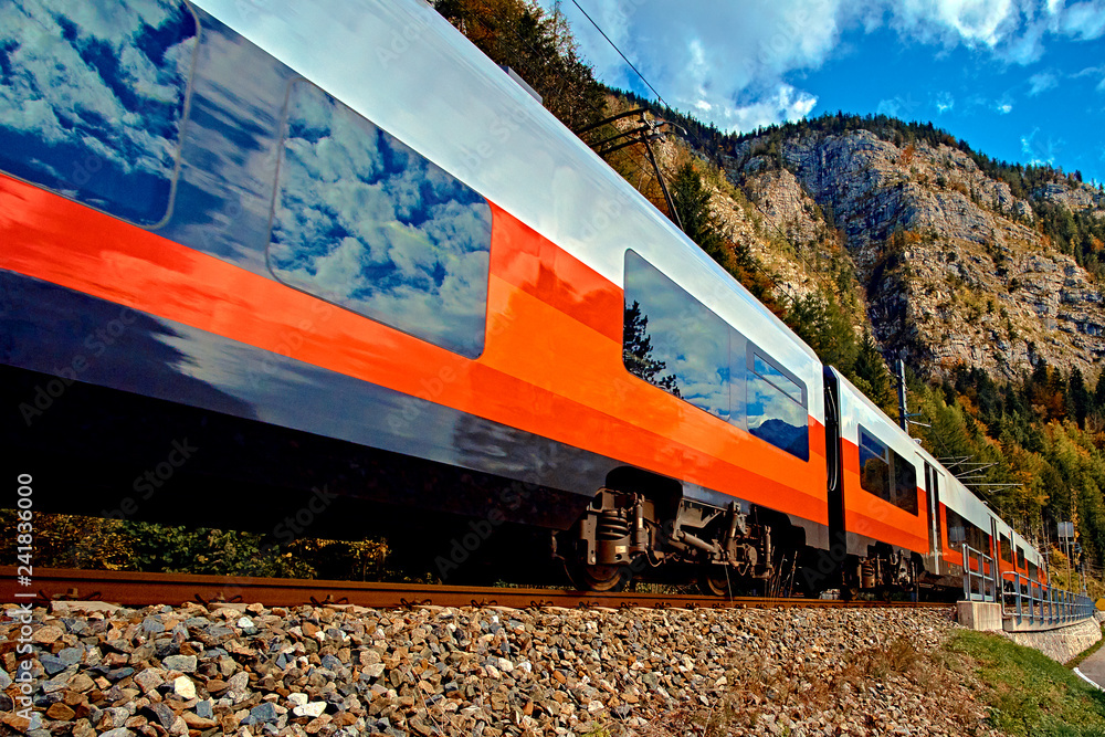 Red blue train in motion in Austrian alps mountains. High speed mountain train arrives at Hallstatt Obertraun train station in mountains. Location: resort village Hallstatt, Salzkammergut, Austria