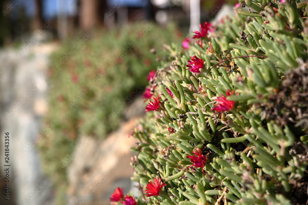 Czerwono kwitnące skalniaki, skalne rośliny, rosną na murku, z bliska, w rozmytym tle inne, podobne rośliny