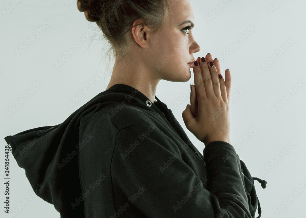 Young beautiful pensive girl in black clothes praying hopefully, over white background