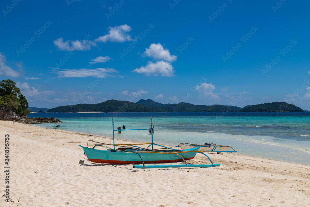 Tropical background view from Malcapuya island with traditional philippines boat and white sand beach. Travel vacation at Philippines.
