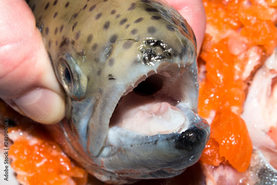 Trout head with open mouth.Trout fish.The teeth of the trout.Fresh gutted trout.Trout fish is a family of salmonids.Freshwater trout.
