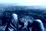 Man traveler sits on top and enjoys view of the picturesque landscape and the city. Point of view shot. Travel, adventure, tourism concept