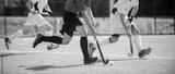 Close up of three field hockey players, challenging eachother for the control and posession of the ball during an intense, competitive match on professional level
