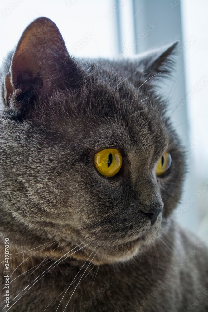 Thoroughbred and adult gray short-haired British cat with yellow eyes. Lovely kitten.