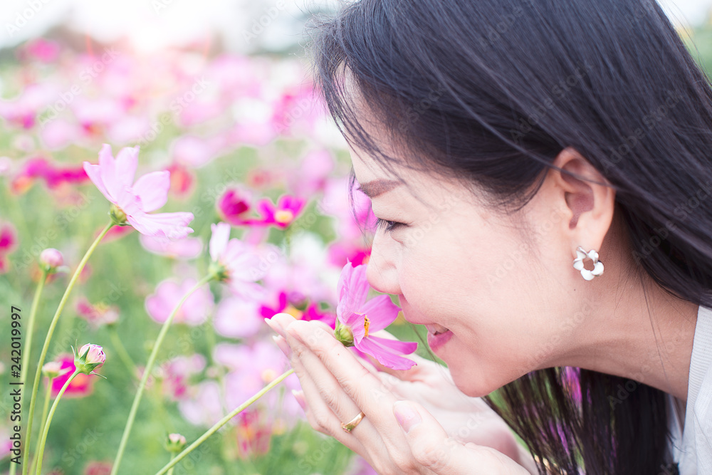 Beautiful smile asian woman in the cosmos field