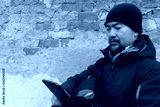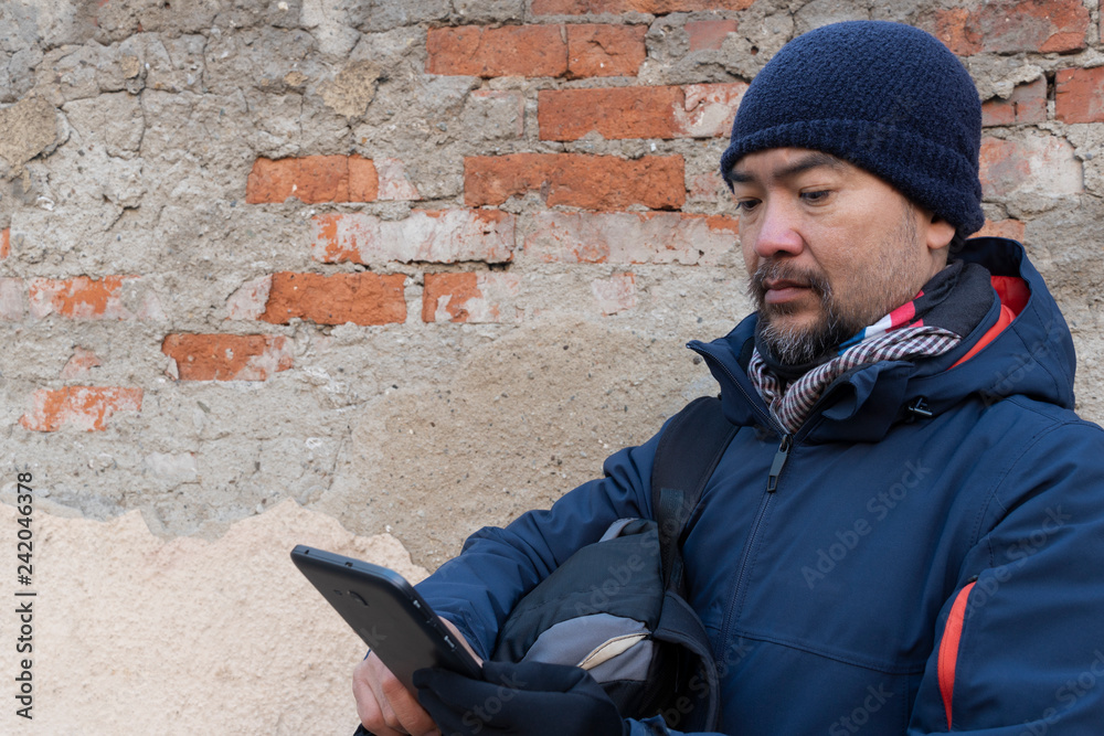 mature adult man in blue winter coat using tablet for travel with brick wall urban background