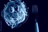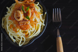 Spaghetti pasta with tomato sauce and basil on plate on dark table.