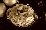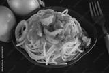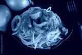 Spaghetti pasta with tomato sauce and basil on plate on dark table.