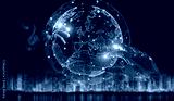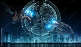 Robot hand and human hand touching digital world 3D rendering