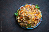 Uzbek plov a rice dish prepared with lamb, stewed with fried onions, garlic and carrots rice, dried fruits, garlic and cumin.