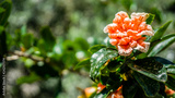 Amazing view of bright vibrant orange roses blooming in garden at warm sunny summer day with green trees and greenery forest landscape. Beautiful flower leaf wallpaper concept, colorful background.