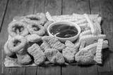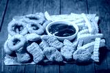 fast food products: onion rings, french fries and chicken nuggets