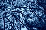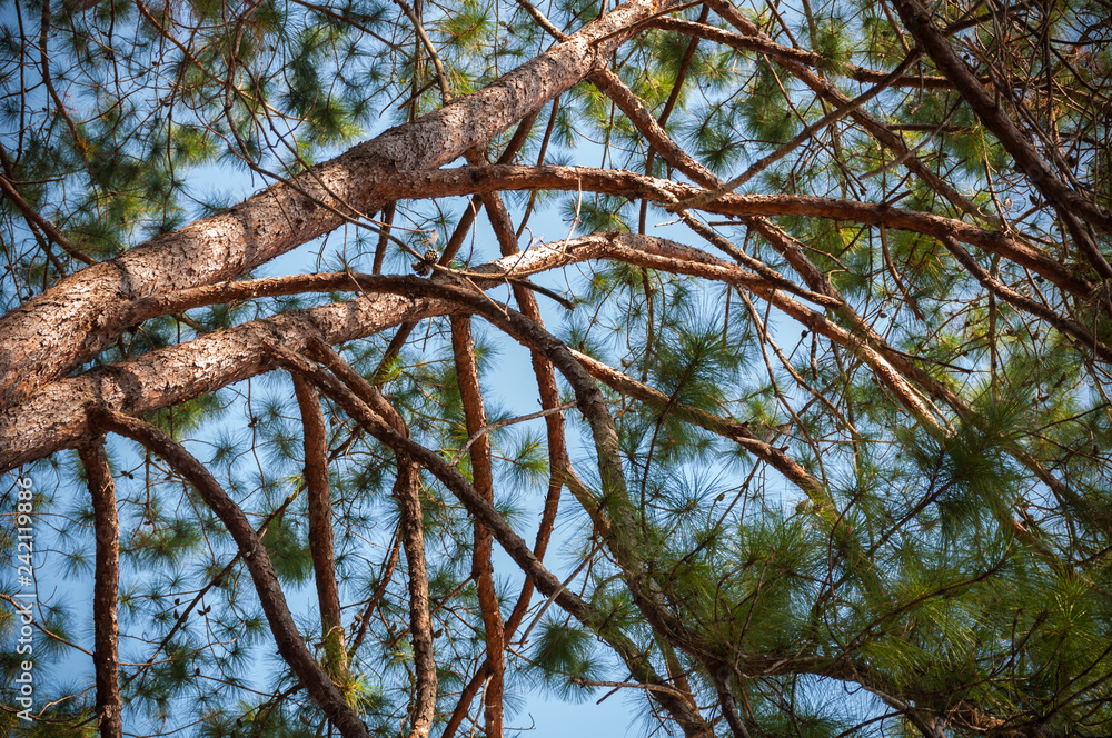 Close up Kesiya Pine tree branch at top mountain with blue sky background