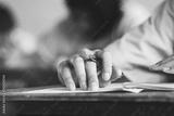 Close-up to student holding pen and writing final exam in examination room or study in classroom.Vintage style