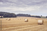 Straw round bales on a field at the end of the harvest season, color toned picture.
