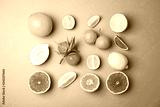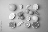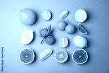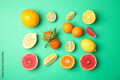 Different citrus fruits on color background, flat lay