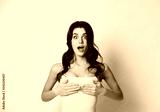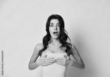 Young woman surprised shouting touch breast chest with free text copy space plastic surgery and aesthetic cosmetology