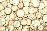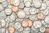 Various USA, American coins for business, money, financial concept background. Pile of Golden coin, silver coin, copper coin, quarters, nickels, dimes, pennies, fifty cent piece coins and dollar coins