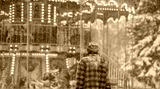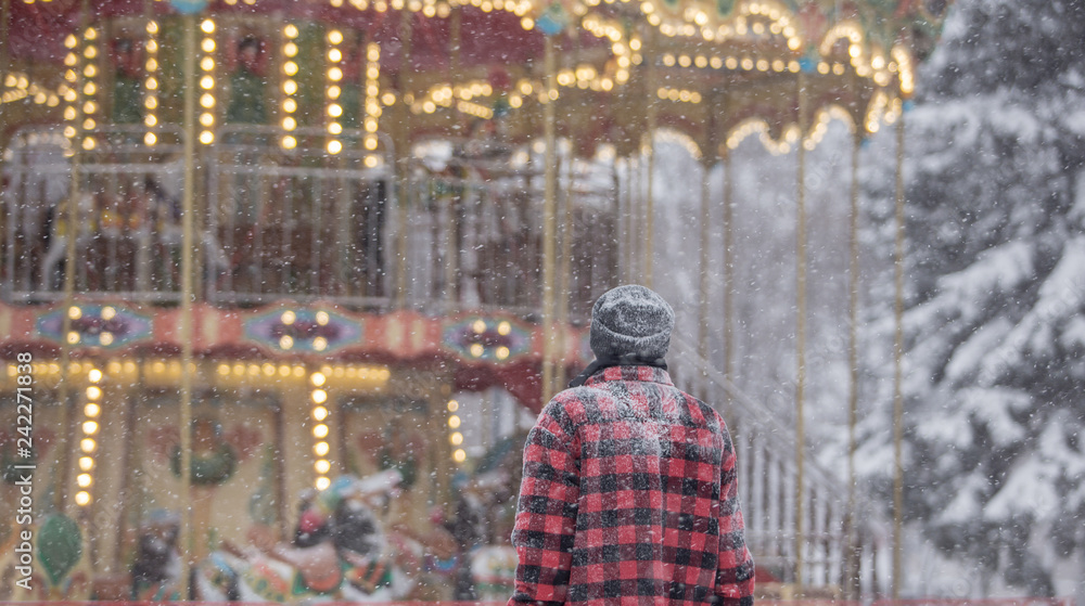 man in a warm jacket near the Victorian carousel