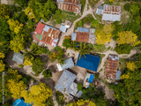 Aerial view of tropical island Malcapuya. Beautiful tropical island with sand beach, palm trees. Palawan, Philippines.