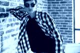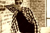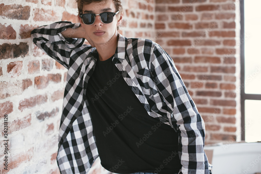 Hipster teenage boy posing in black t-shirt and sunglasses