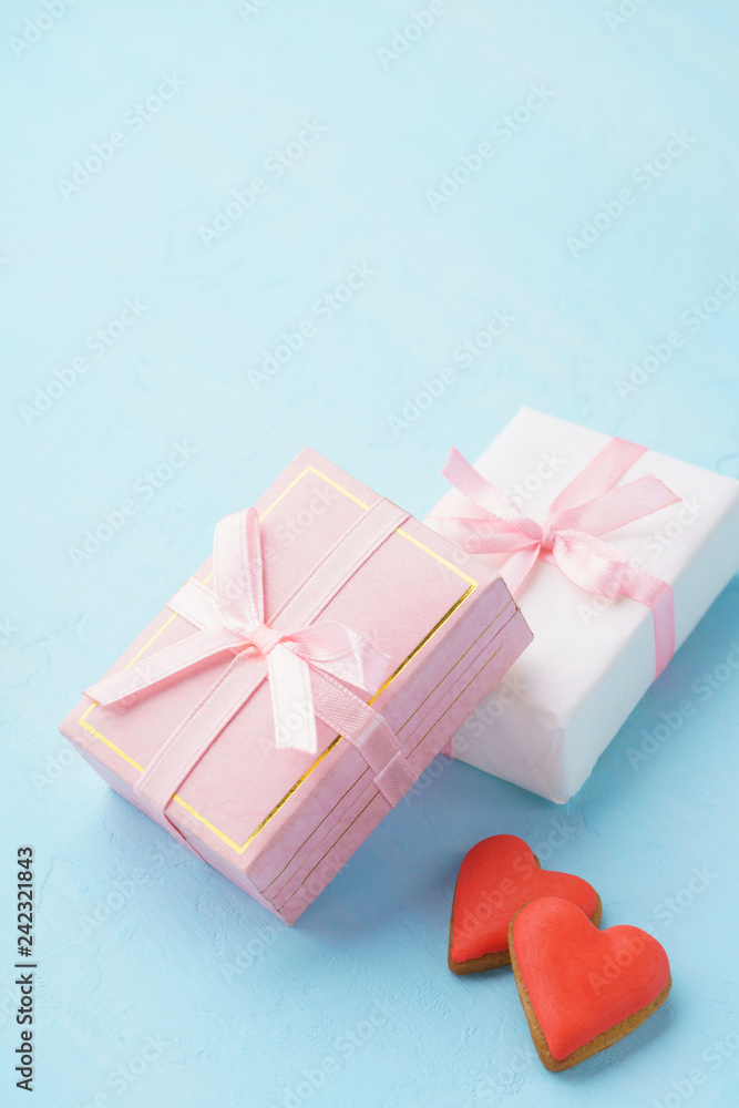 Gift boxes with pink ribbon and red heart shaped cookies.