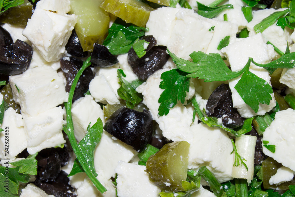 Greek salad.Background of Greek salad.Salad with cheese, cucumbers and olives.